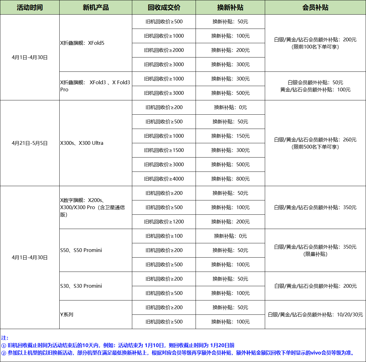 活动期间,参与vivo商城 以旧换新活动,旧设备回收成交价≥200元、≥500元、≥1000元等不同金额,并购买以下新机,可享受对应换新补贴+专属会员补贴: