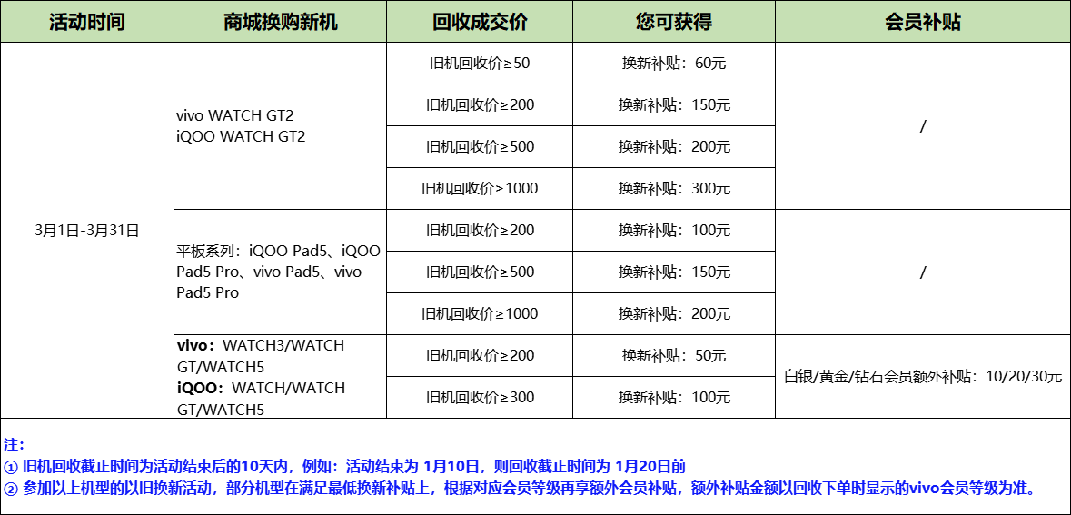 活动期间,参与vivo商城 以旧换新活动,旧设备回收成交价≥200元、≥500元、≥1000元等不同金额,并购买以下新机,可享受对应换新补贴+专属会员补贴: